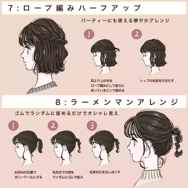 ショートヘアアレンジ術その2簡単結ぶだけアレンジ 「ローポニー」でゆるっとまとめる 「くるりんぱ」でエレガントに 「三つ編み」できちんとお行儀よく 「ロープ編み」で大人ガーリーに; ショートボブにもおすすめなヘアアレンジ 学校にも 簡単ふんわりエアリーボブ わずか10分で完成! 黒髪でも重く見えない、ちょい足しでこなれ感満載のアレンジ。